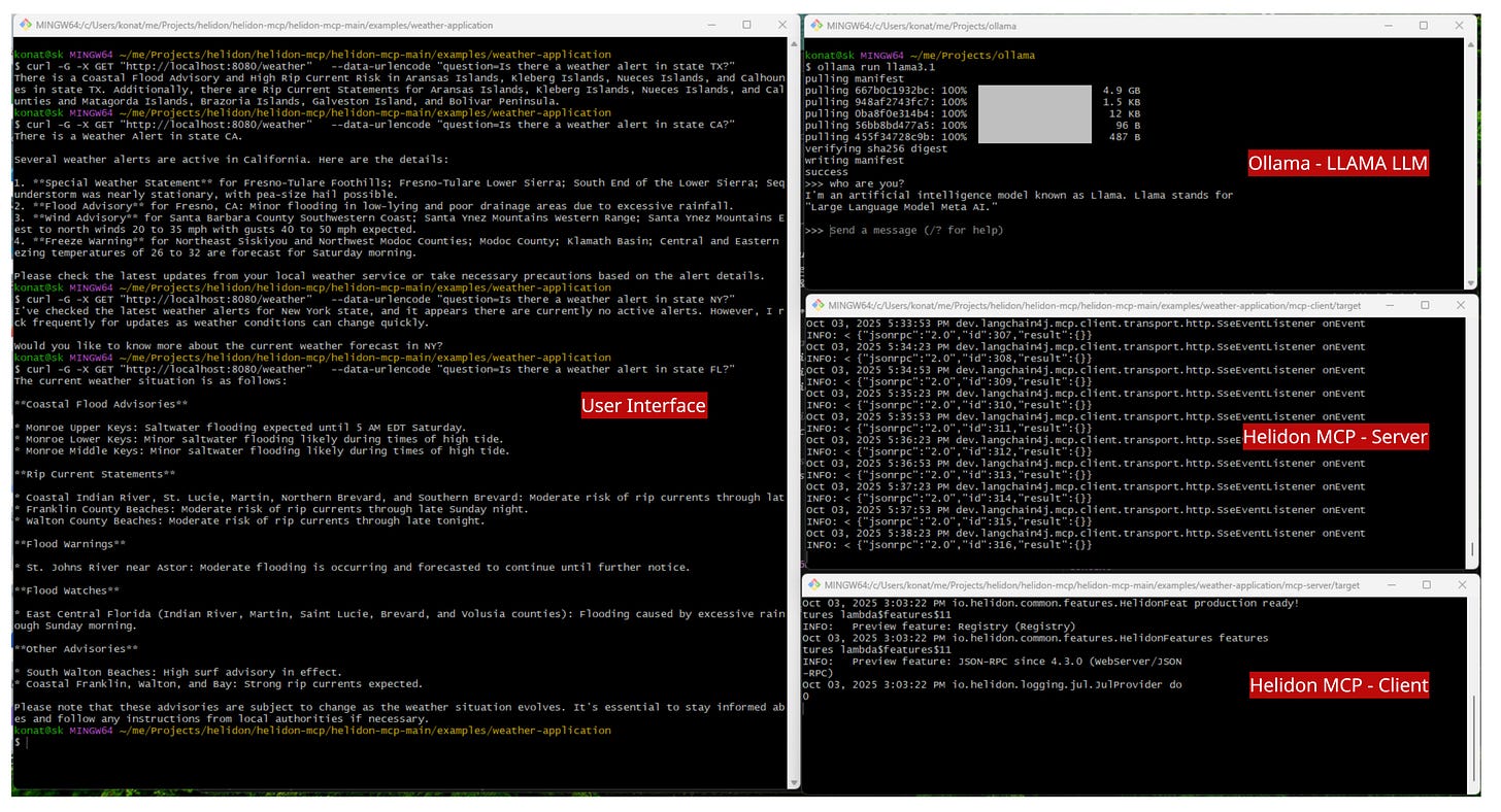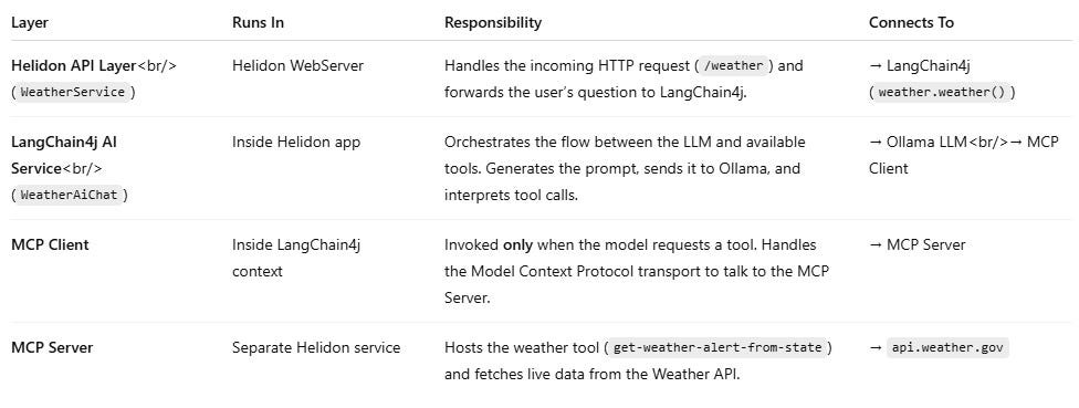 Building modern AI-powered applications isn’t just about sending prompts to a model. The real magic happens when you can augment LLMs with external tools and services, like fetching live weather data. Recently, Helidon, one of my favorite java frameworks, introduced MCP servers, giving Java developers a new way to bridge LLMs with real-world APIs through the Model Context Protocol. That means your AI app isn’t limited to what the model knows it can now reach out, call tools, and bring live information into the conversation.