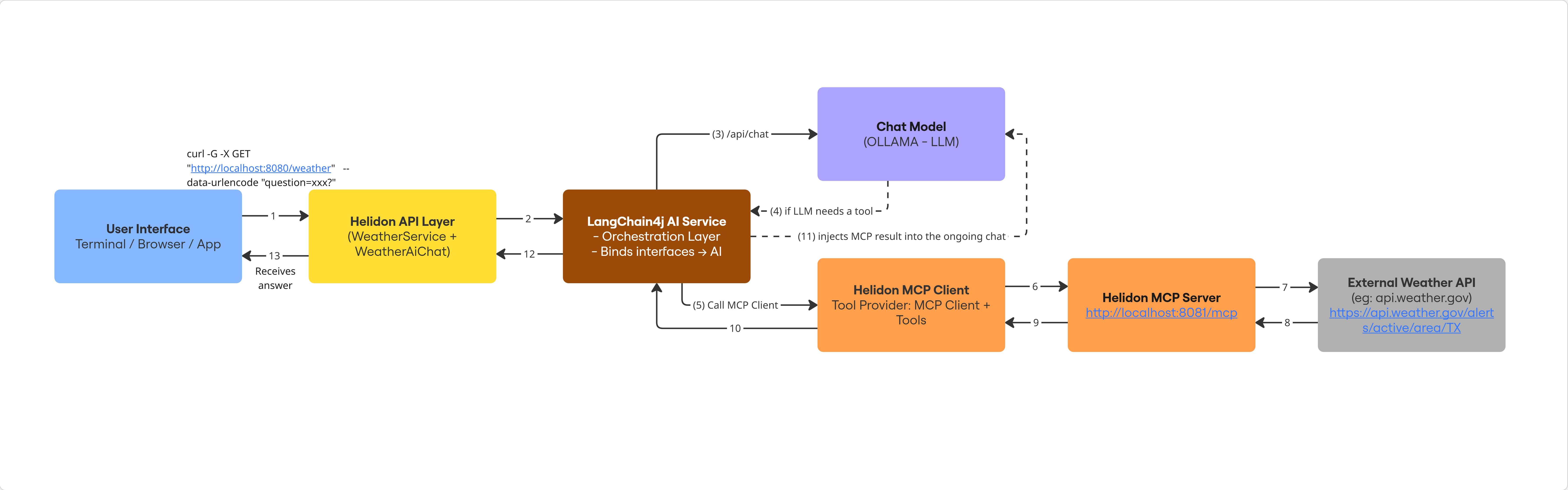 In this blog, we’ll walk through how to wire together LangChain4j, Ollama, and Helidon to create an AI microservice that answers weather-related questions. Along the way, we’ll unpack the moving parts: chat models, MCP clients, tools, and service endpoints.