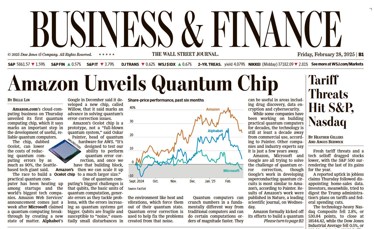 The release of Amazon’s Ocelot (may be named to serve as a way to link the physical animal with the underlying quantum principles of the chip)